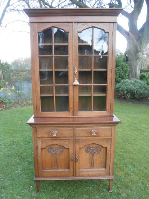 Antique Arts & Crafts Oak Bookcase on Cabinet c.1890