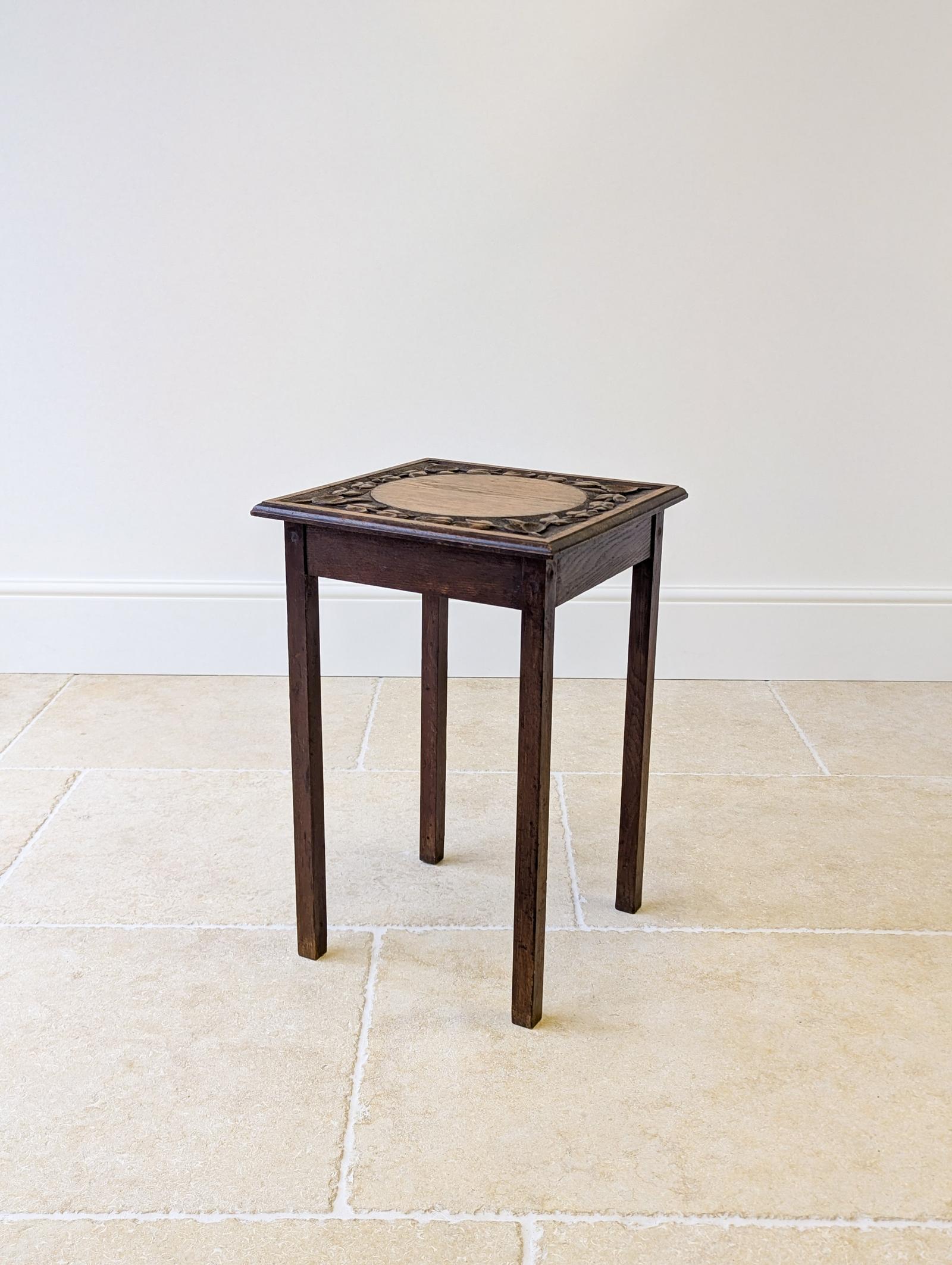 A small early 20th century oak occasional table in the Arts & Crafts taste, the square top framed with deep foliate relief carving against a darker recessed ground, centred by a plain circular reserve, over a simple base of slender square legs and a plain apron.