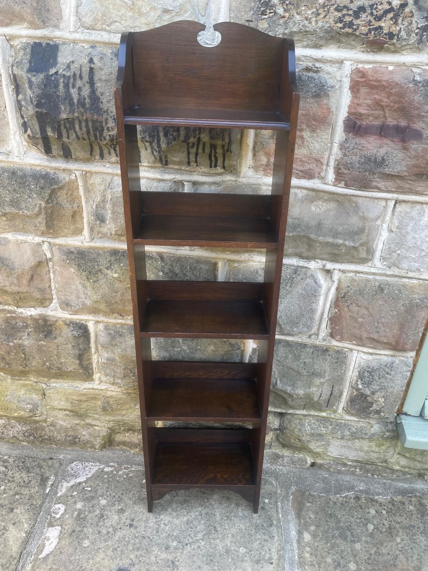 Nice slim size & proportions, in solid oak, raised gallery top having 5 fixed height shelves. Polished oak sides.