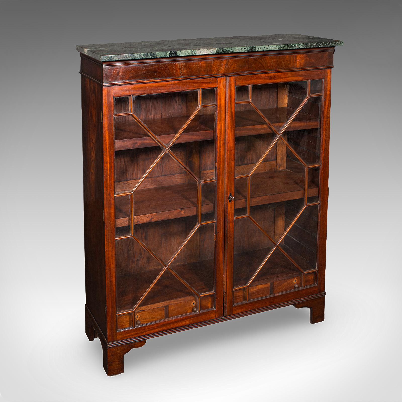 This is an antique astragal glazed bookcase. An English, mahogany and marble display book cabinet, dating to the late Victorian period, circa 1880.