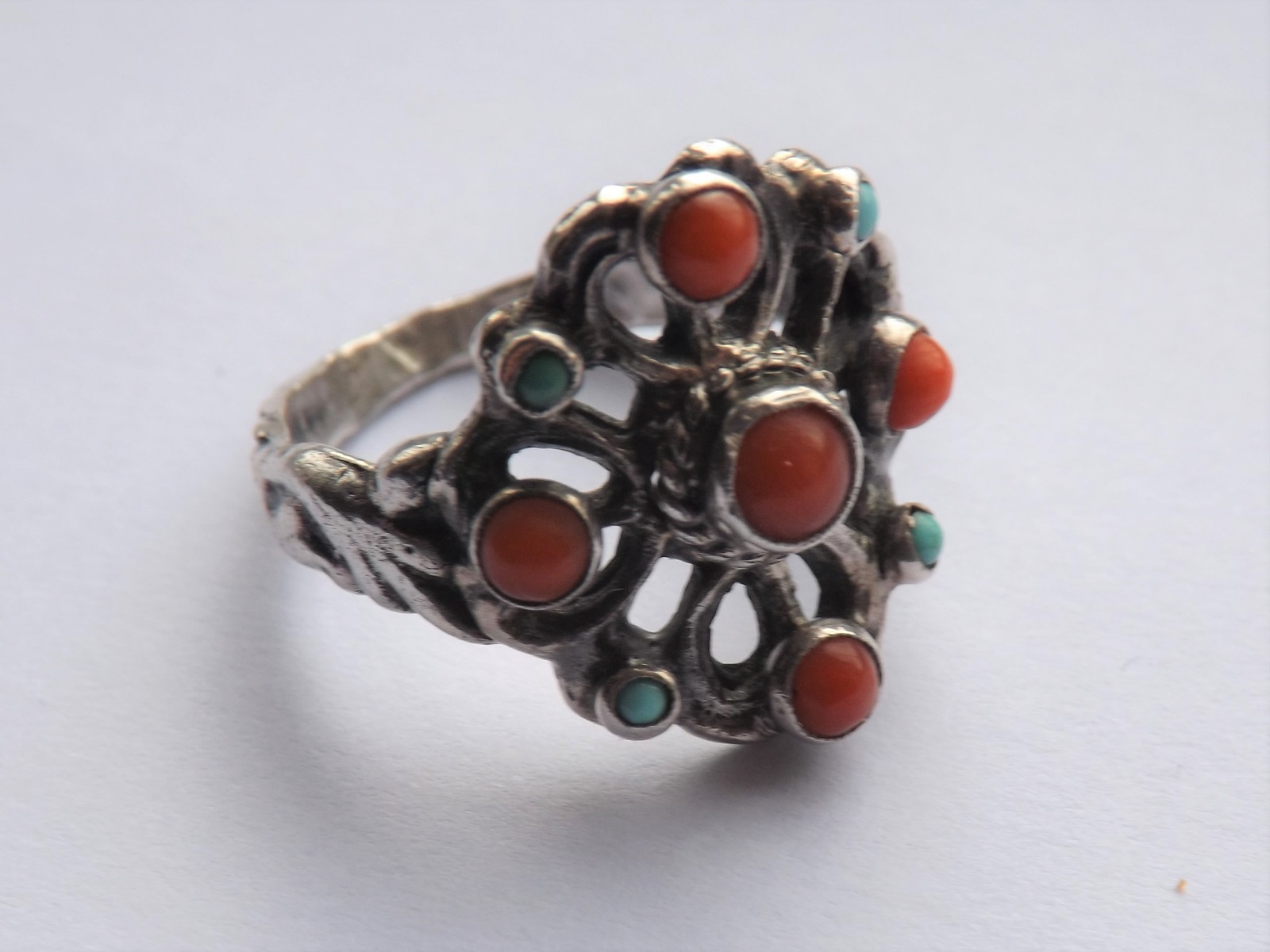 Antique Austro-Hungarian Arts & Crafts Silver, Turquoise & Coral Ring c.1900 (1 of 1)