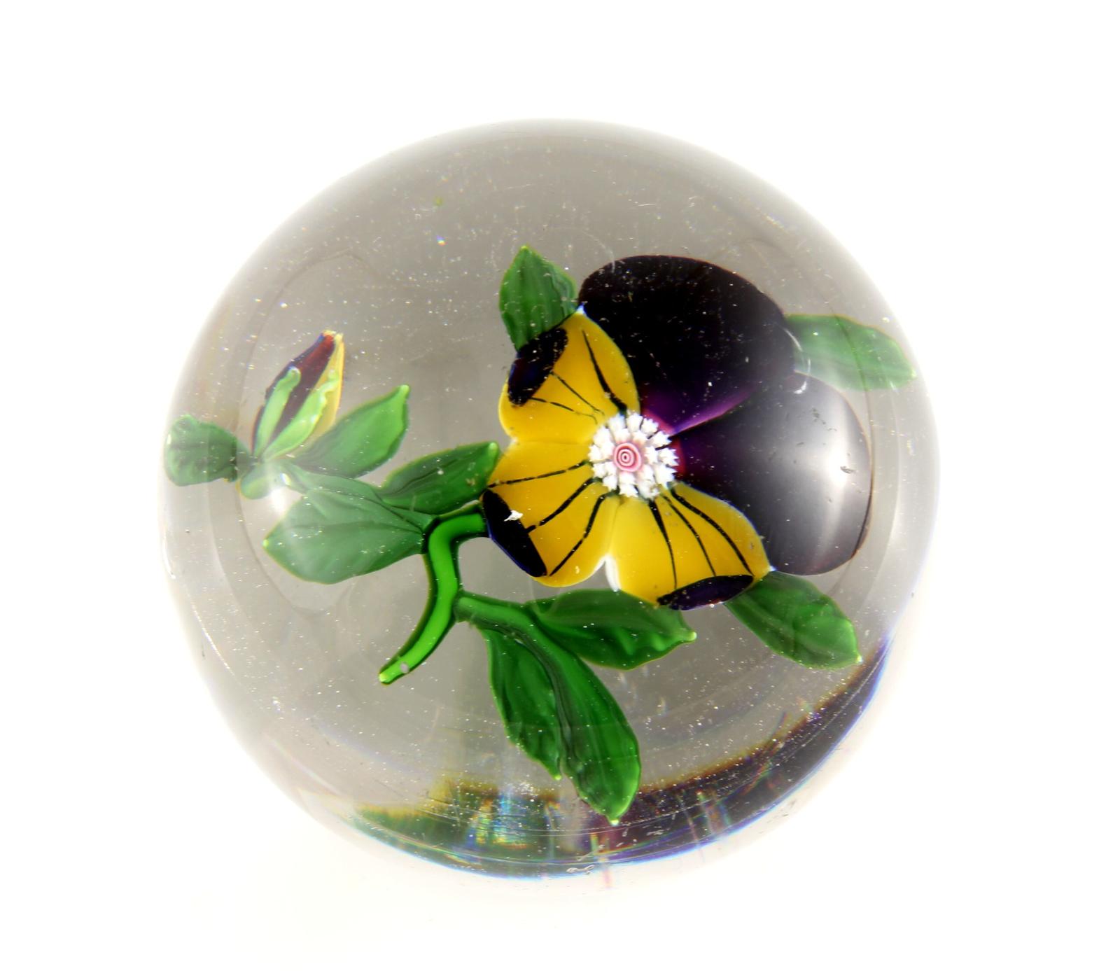 This heavy glass paperweight has a burgundy and yellow pansy with hints of blue, a white and pink centre and several green leaves.