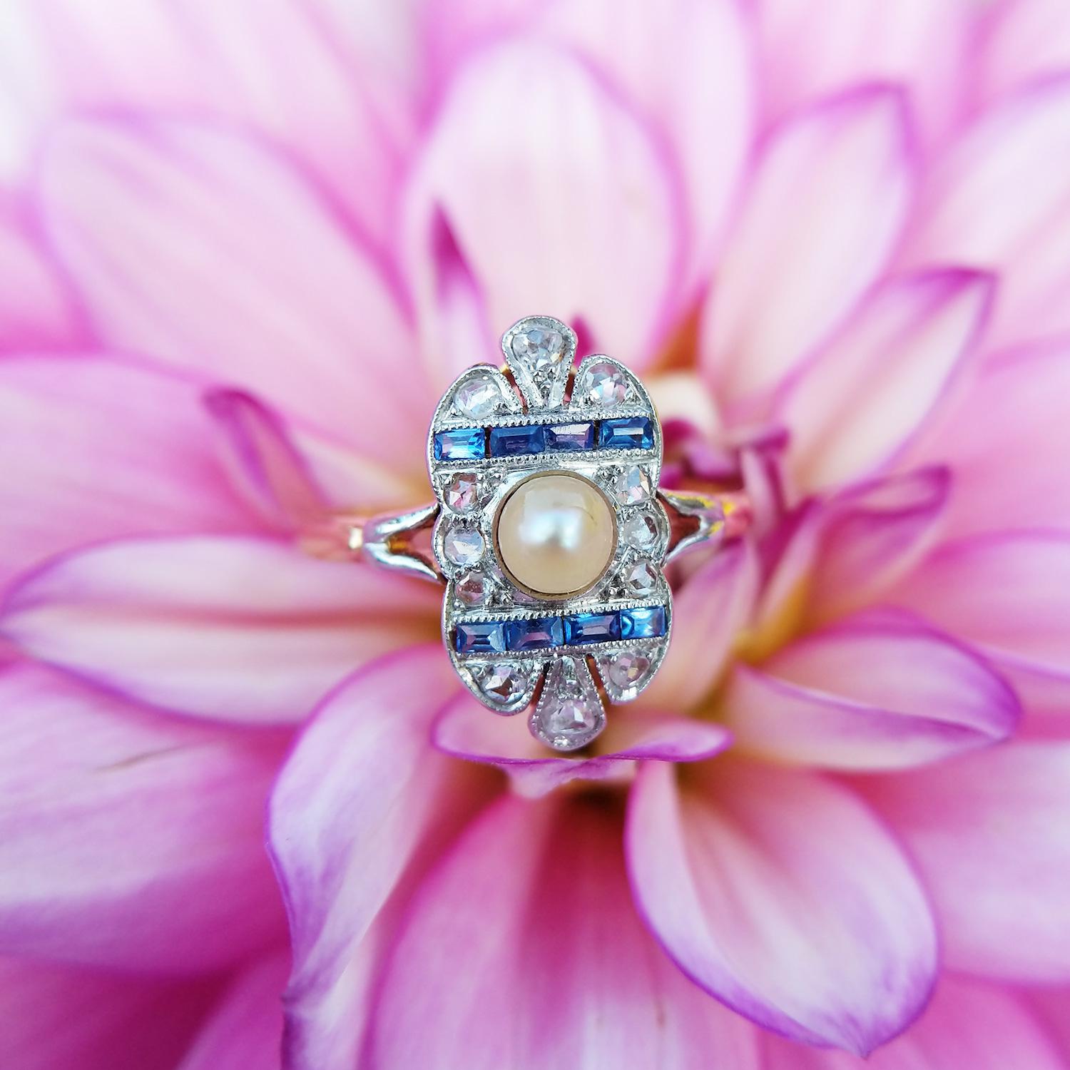 Antique Belle Époque French 18ct Gold Platinum Pearl, Diamond & Sapphire Ring
