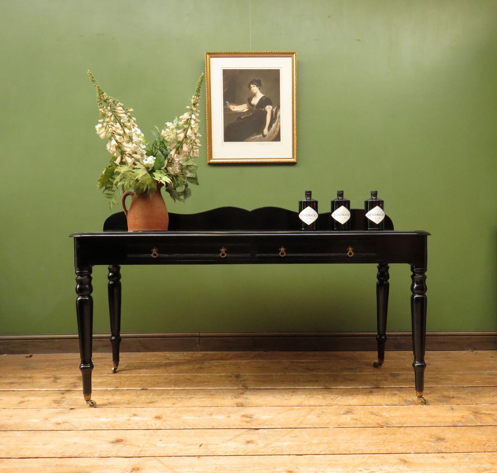 Antique Black Ebonized Console Table with Drawers & Moustache Back