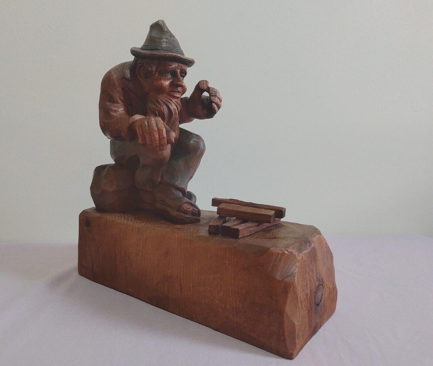 Antique Black Forest Hand Carved Seated Wooden Gnome Figure by Campfire