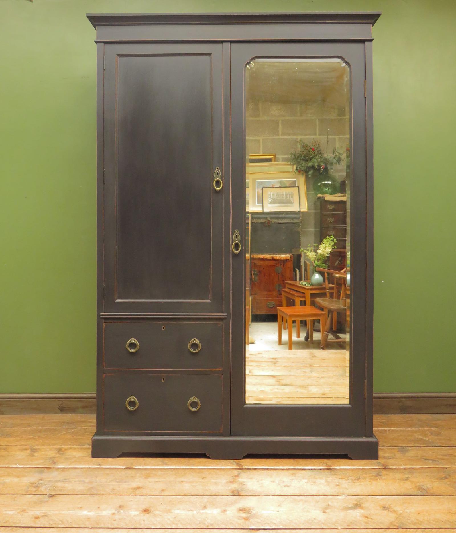 Antique Black Painted Double Wardrobe with Mirror in 4 Parts, Gothic Shabby Chic