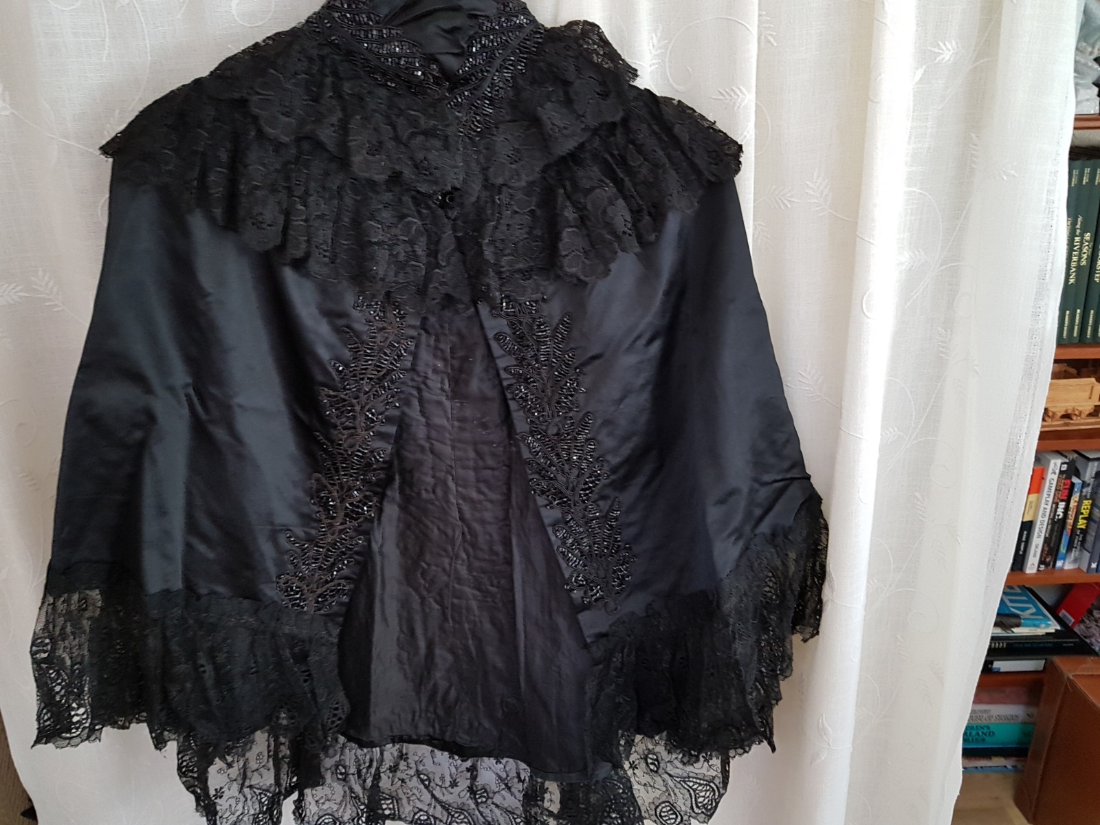 Antique Black Victorian Cape, Cloak: Jet Beads, Silk Satin & Chantilly Lace
