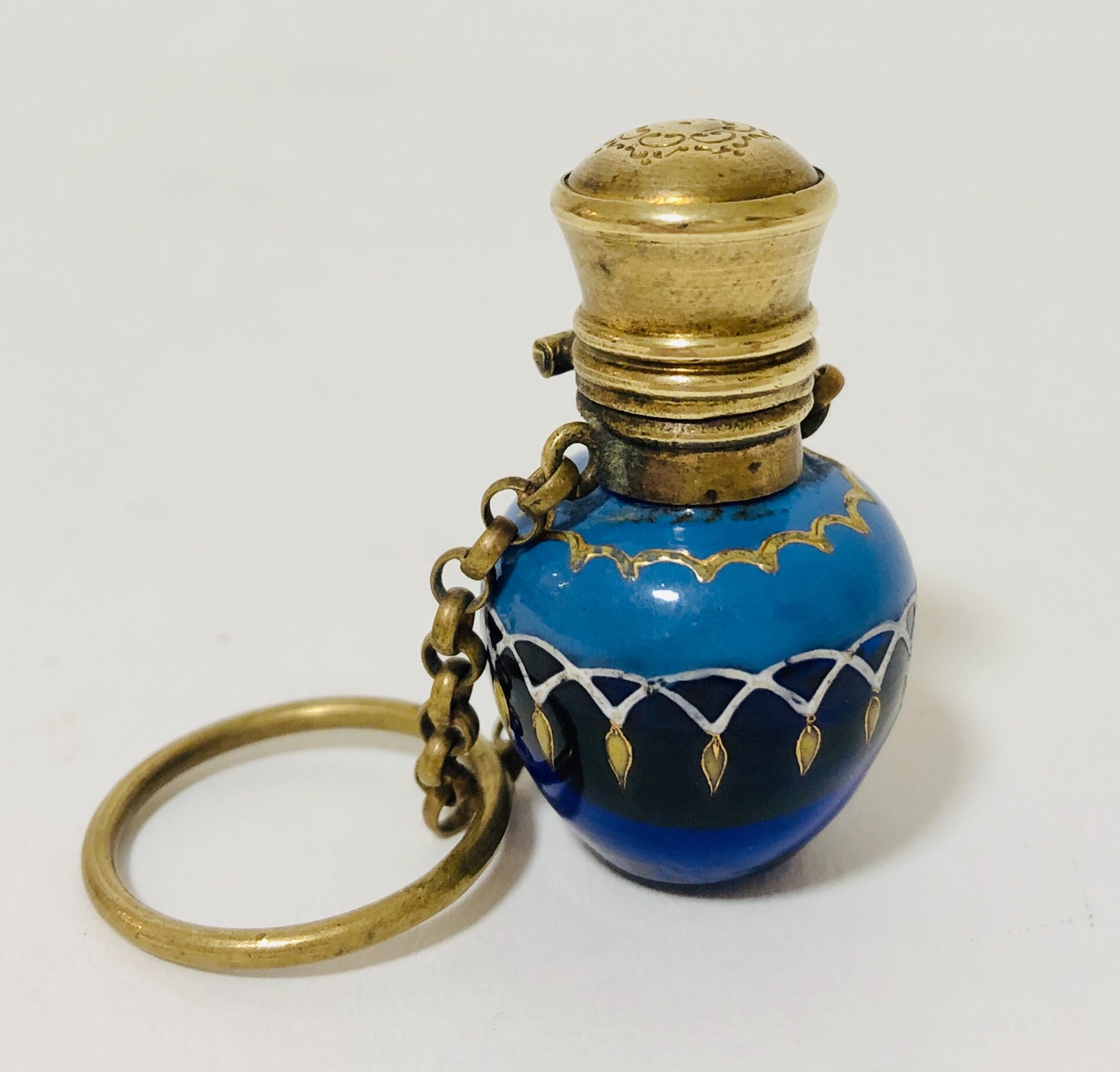 Antique Blue Glass Gilt Painted Scent Bottle Chatelaine