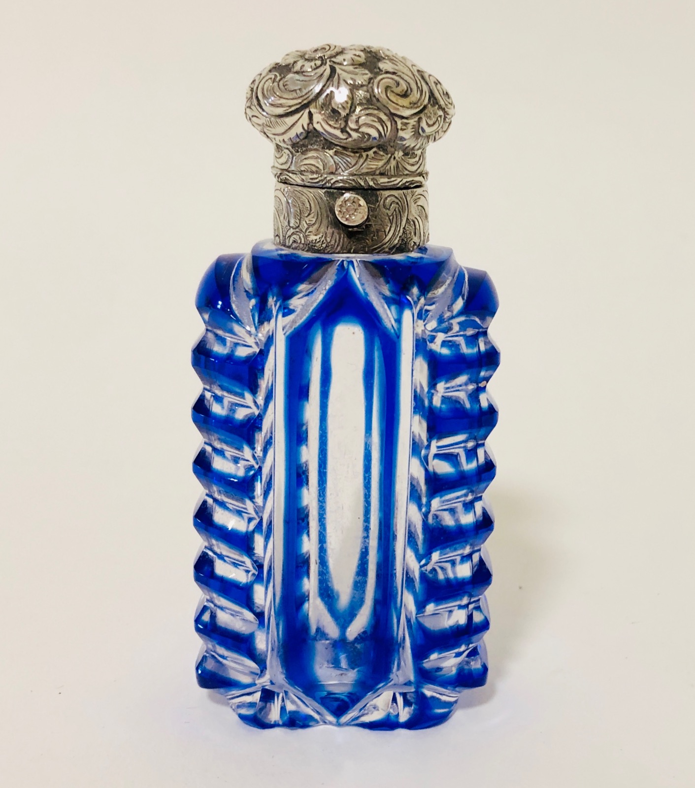 Antique Blue Glass Overlay Scent Bottle with Silver Top