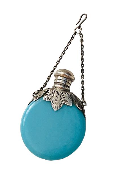 Antique Blue Opaline Disc Form Chatelaine Perfume Scent Bottle with Sterling Silver Mounts c.1880