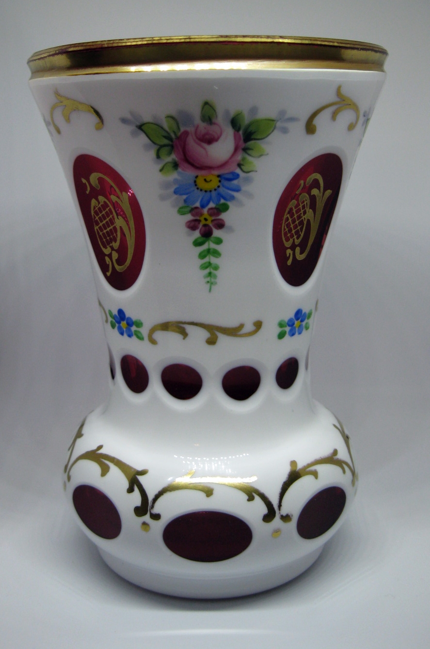 Antique Bohemian Cased & Flashcut Cranberry Vase with Floral & Gilt Decoration