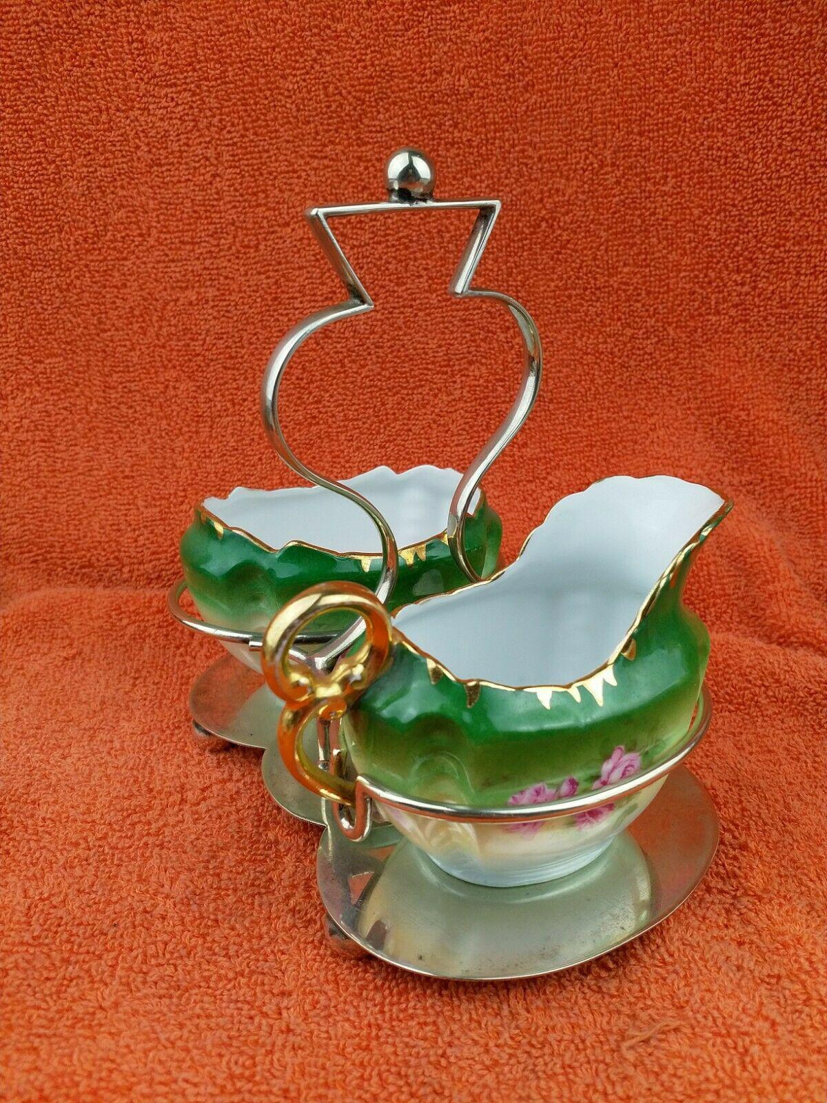 Antique Bone China Milk Jug & Sugar Bowl in Silver Pate Carry Stand C1890