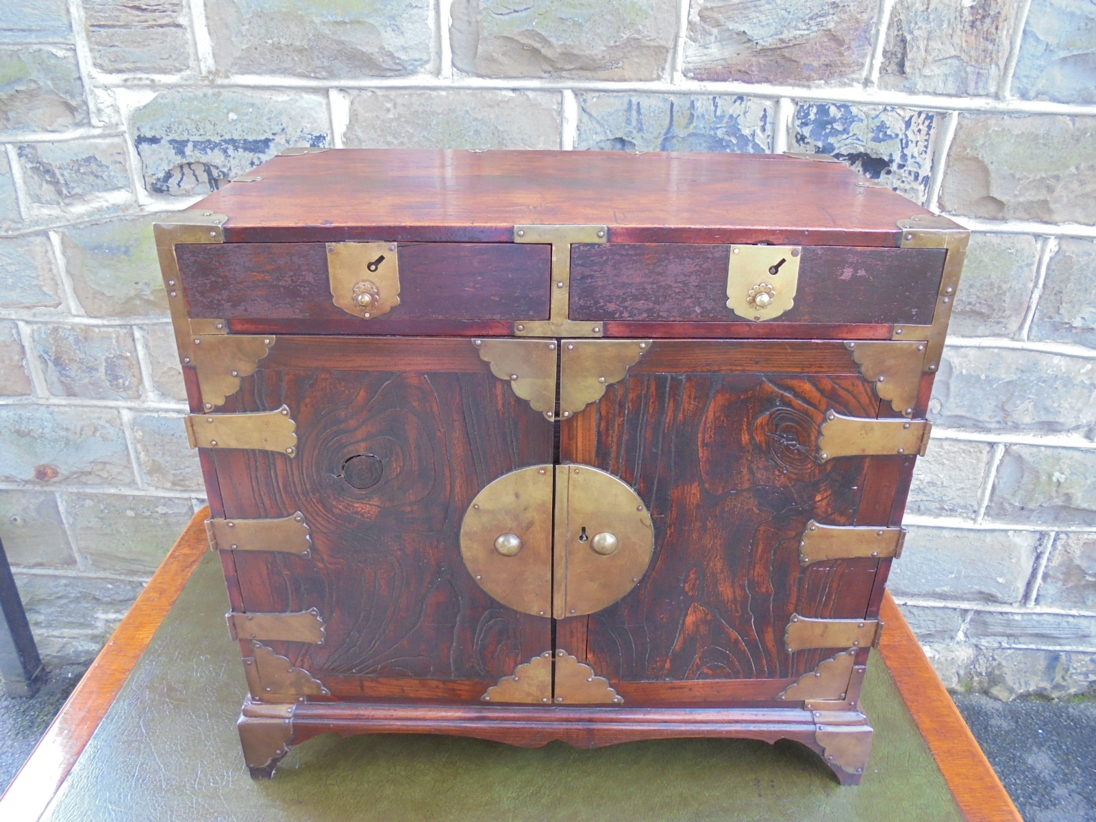 Antique Brass Bound Elm Table Cabinet