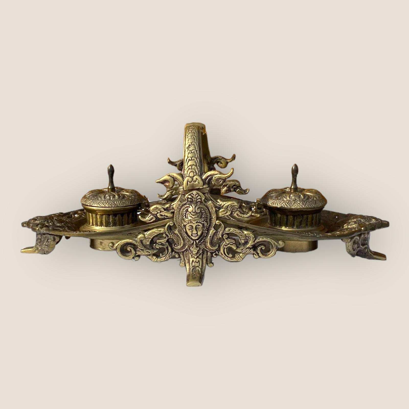 Antique Brass Inkwell Stand - Mantel Decoration