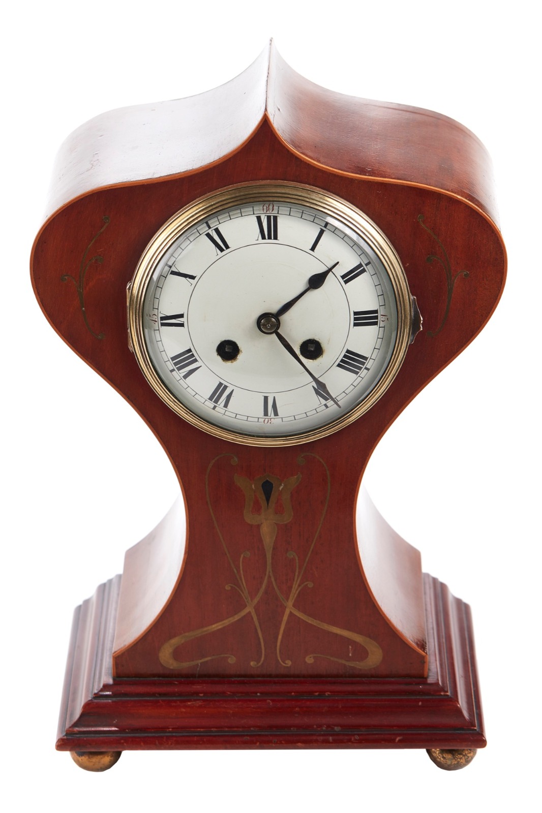 Antique Brass Inlaid Mahogany Art Nouveau Balloon Shaped Mantle Clock