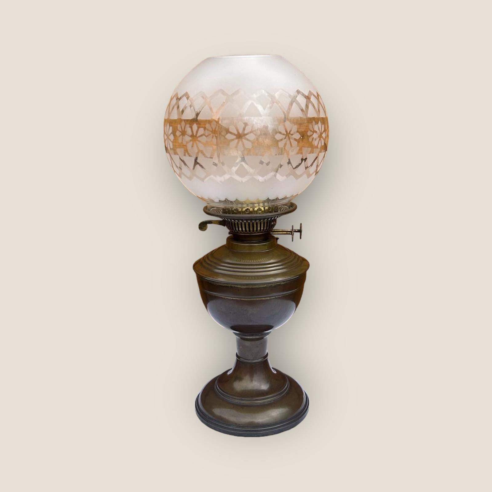 Antique Brass Oil Lamp with a White Patterned Glass Shade