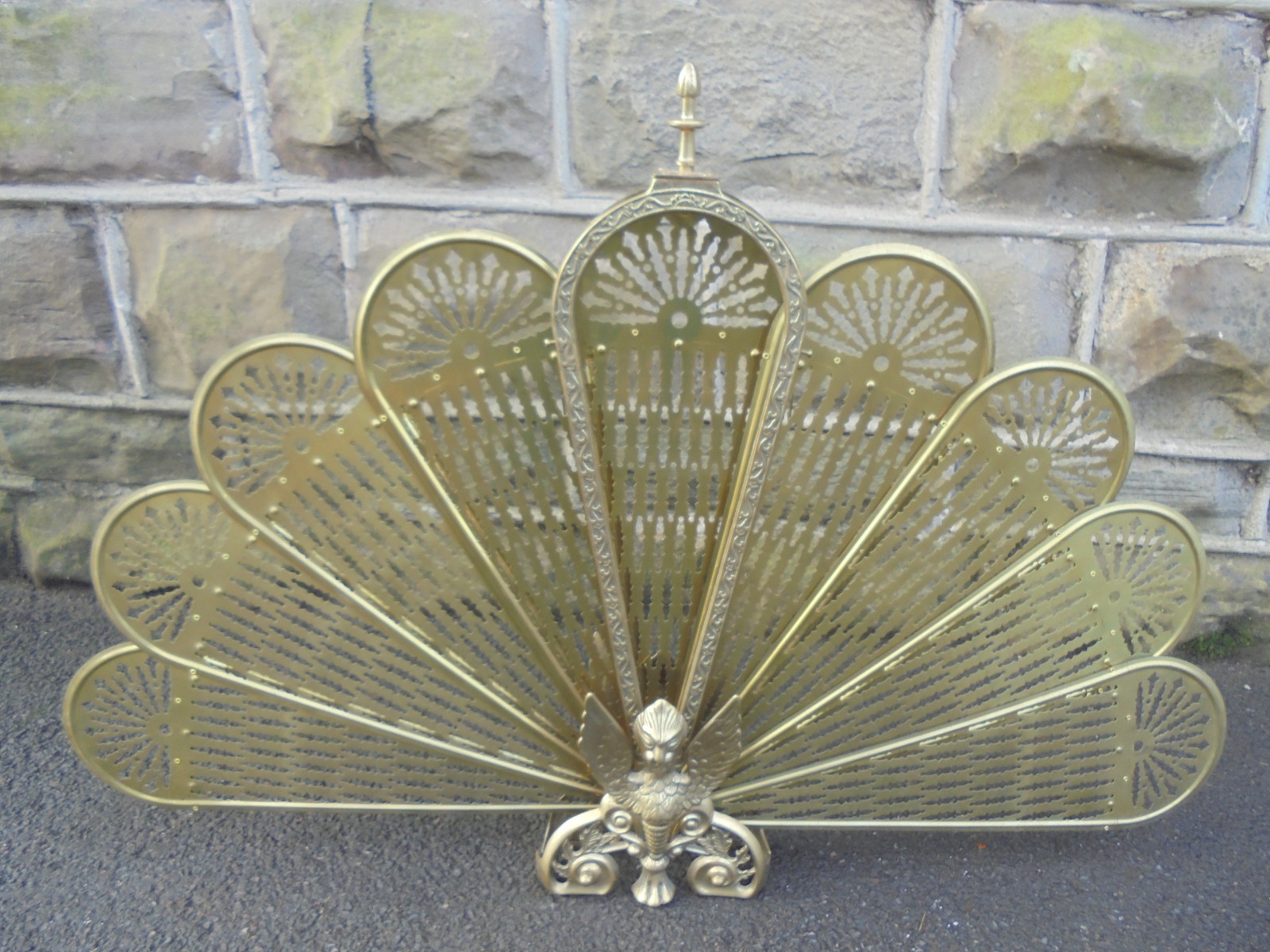 Antique Brass Peacock Design Fan Shaped Fireguard c.1910