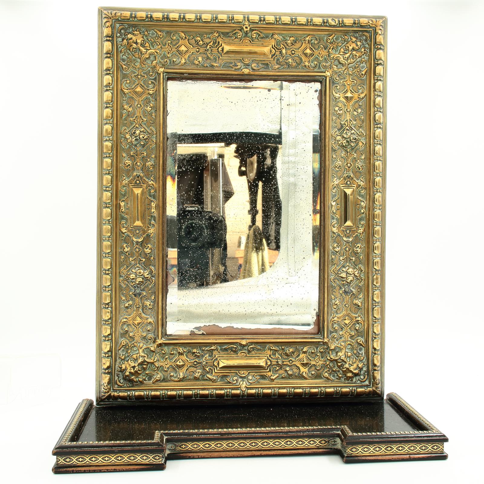 Wonderfully decorative pressed brass antique wall mirror with beautiful rococo style decorations to brass frame, attractive wear and oxidation to mirror backplate, and an ebonized wood shelf. A statement piece for your wall that won't fail to impress.