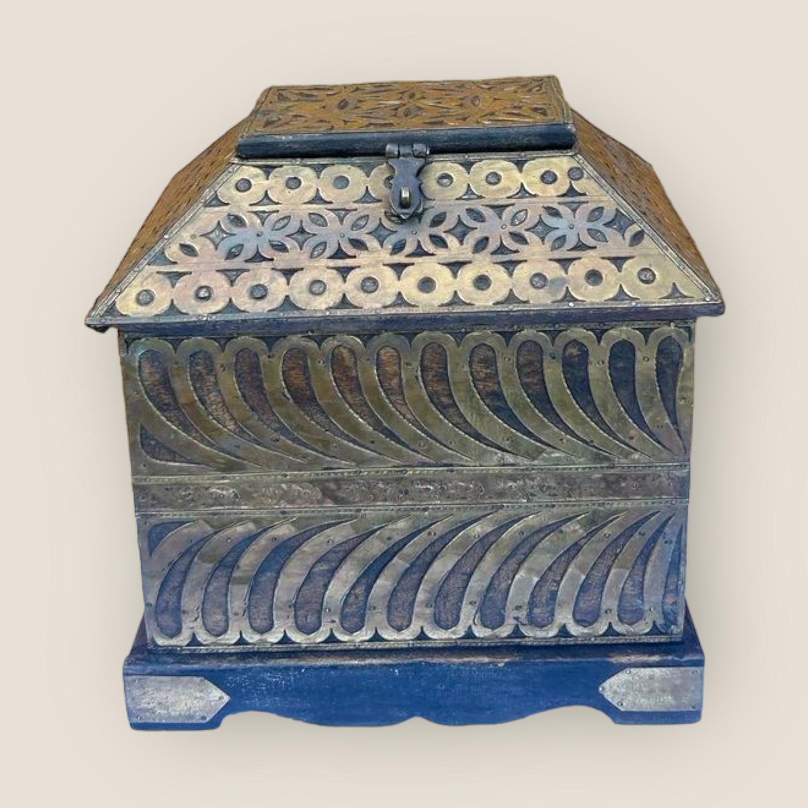 Antique Brass & Wooden Box with a Hinged Wooden Top