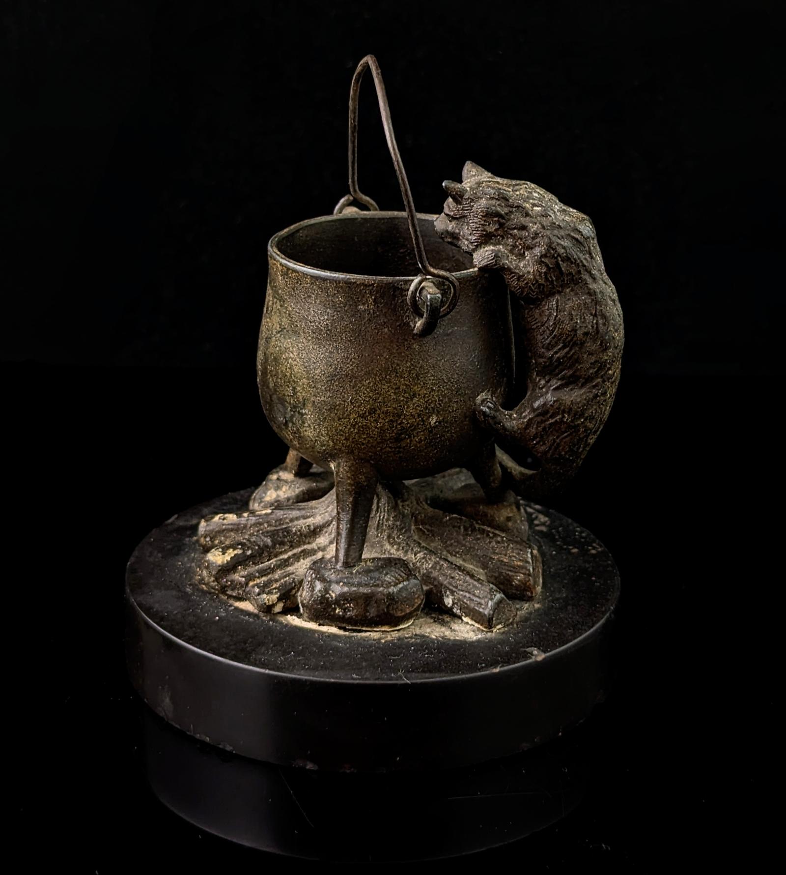 Antique Bronze Cat and Cauldron Sculpture, 19th Century