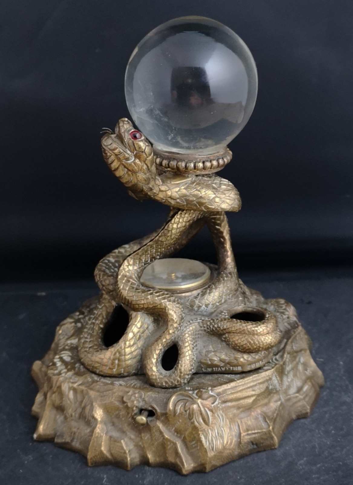 Antique Bronze Snake Inkwell, Desk Stand, Crystal Ball & Compass, Signed & Dated