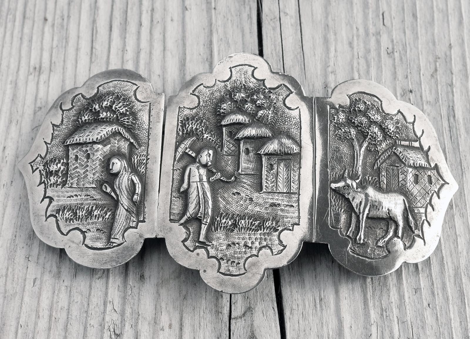 Antique Burmese Silver Belt Buckle, High Relief Repousse, Figures and a Cow c.1880