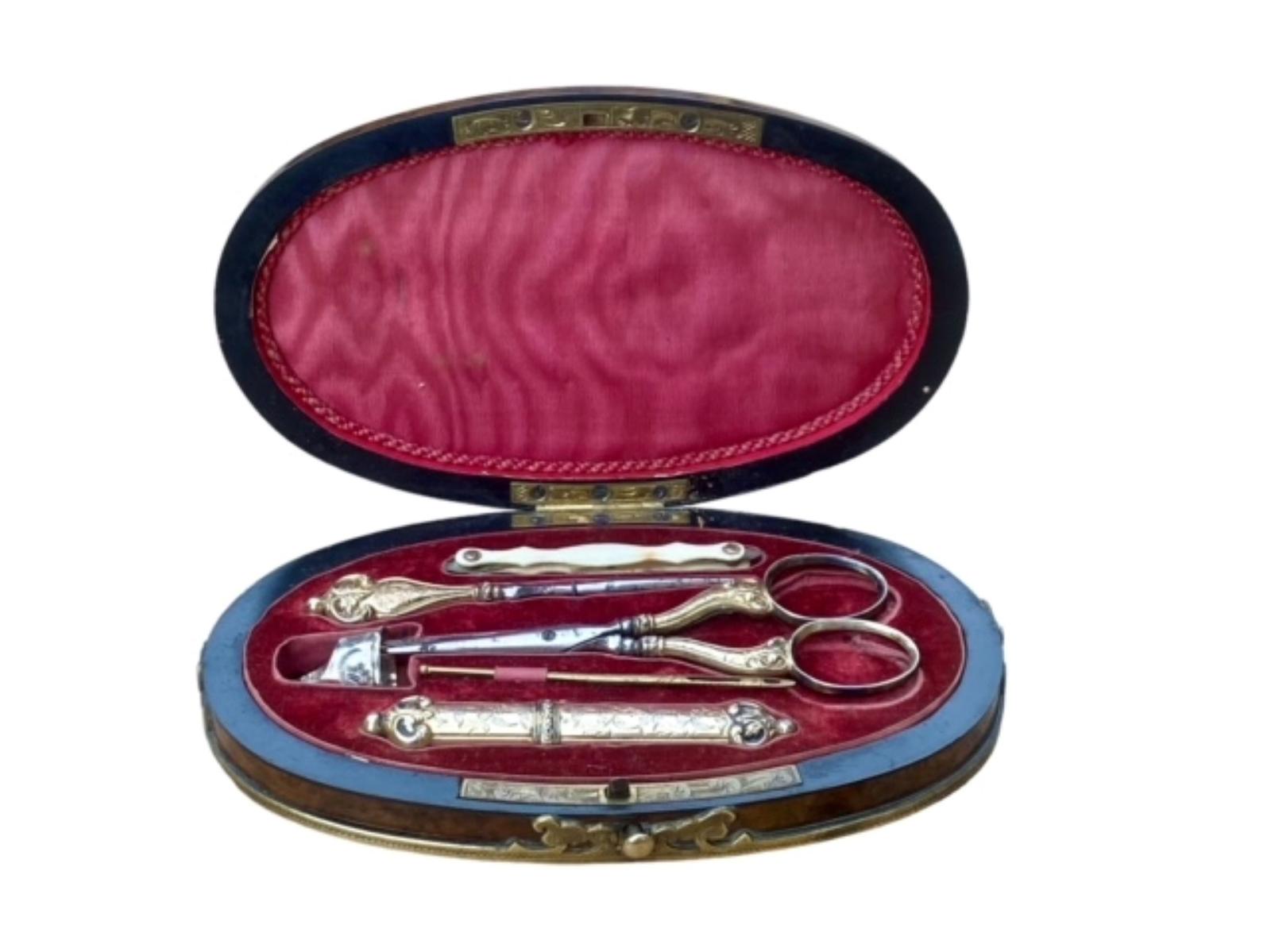 Antique Burr Walnut Cased French Silver Sewing Etui / Set c.1880