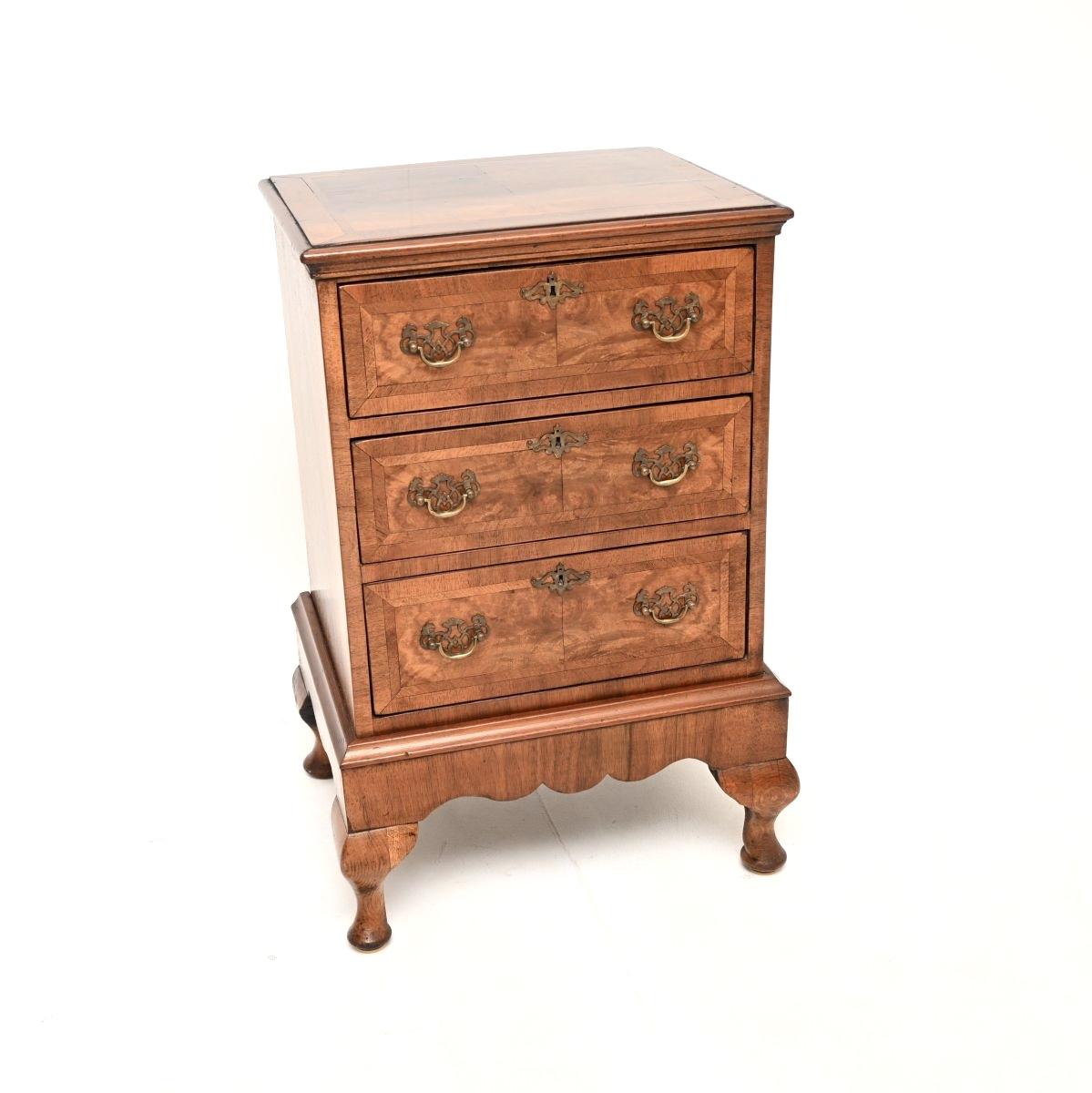 It is nicely made and has stunning burr walnut grain patterns. The drawer fronts and tops are finely cross banded, this has lovely brass hardware and stands on cabriole legs.
