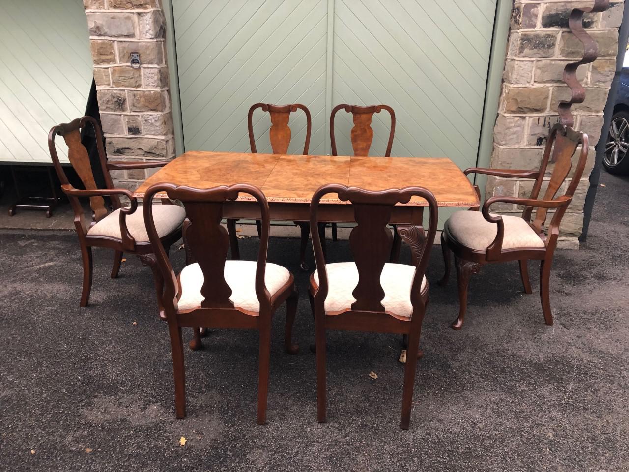 Antique Burr Walnut Dining Table & 6 Matching Chairs