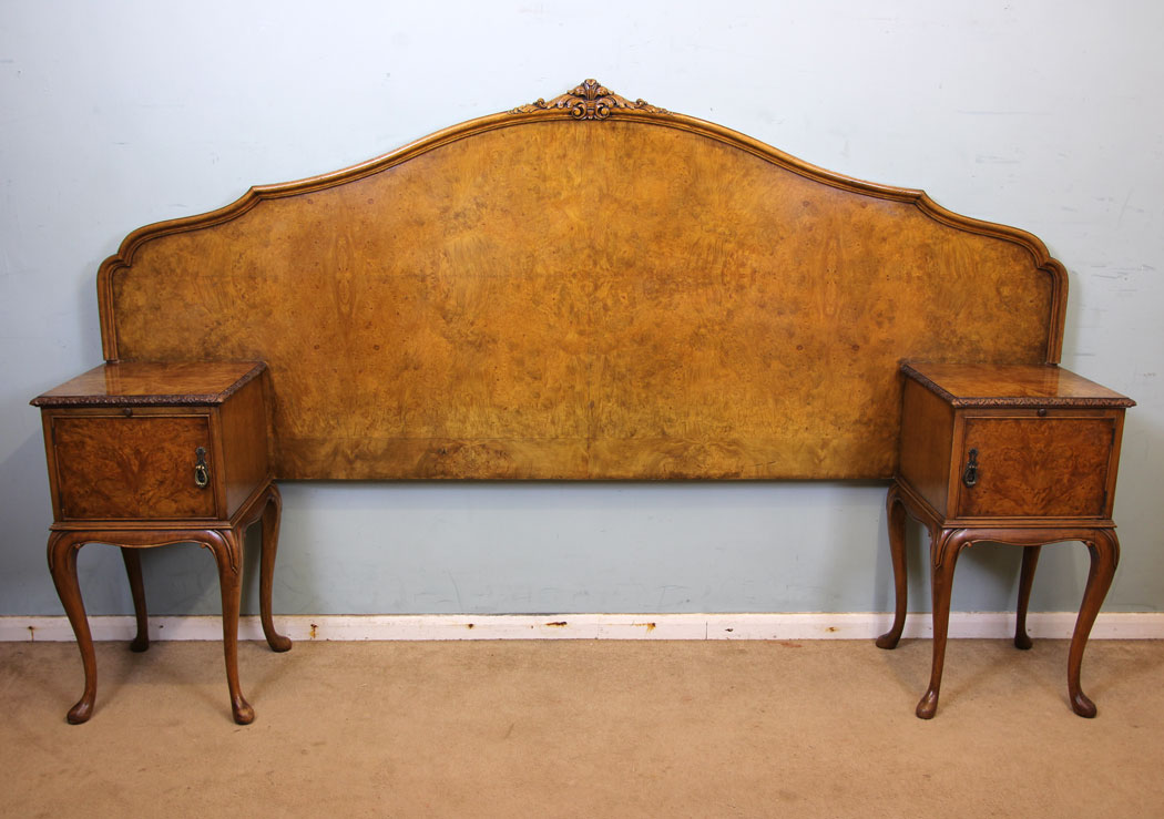 Antique Burr Walnut Headboard with Bedside Cabinets