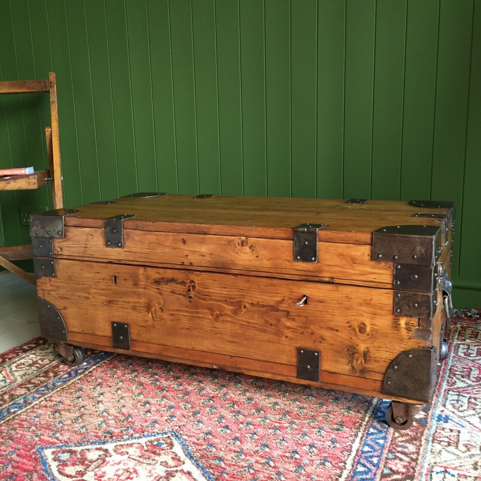 Antique Campaign Chest Old WW1 Military Industrial Footlocker Trunk Coffee Table Rustic Pine Storage Box + Key