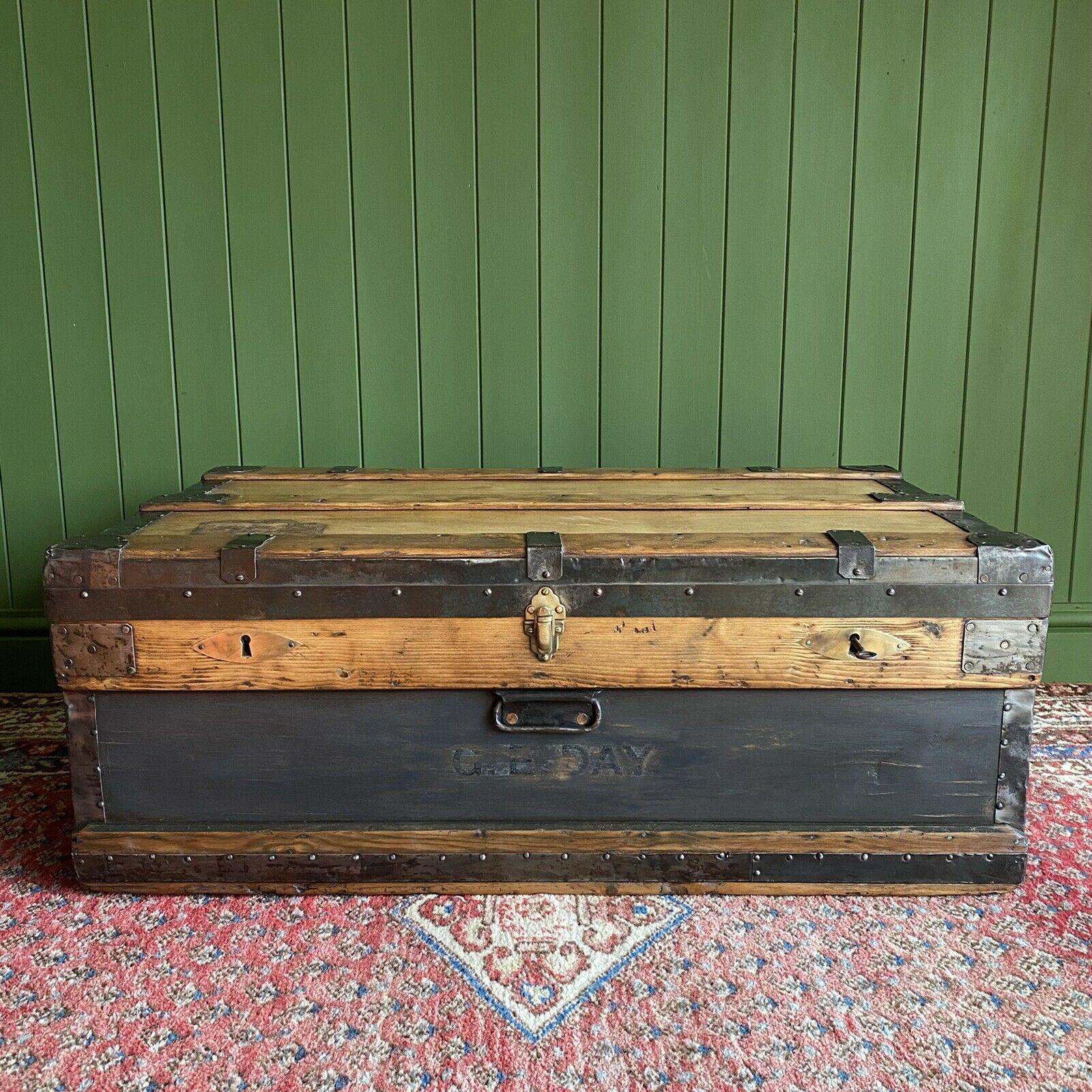 Antique Campaign Chest WW1 Military Wooden Rustic Industrial Storage Trunk + Key