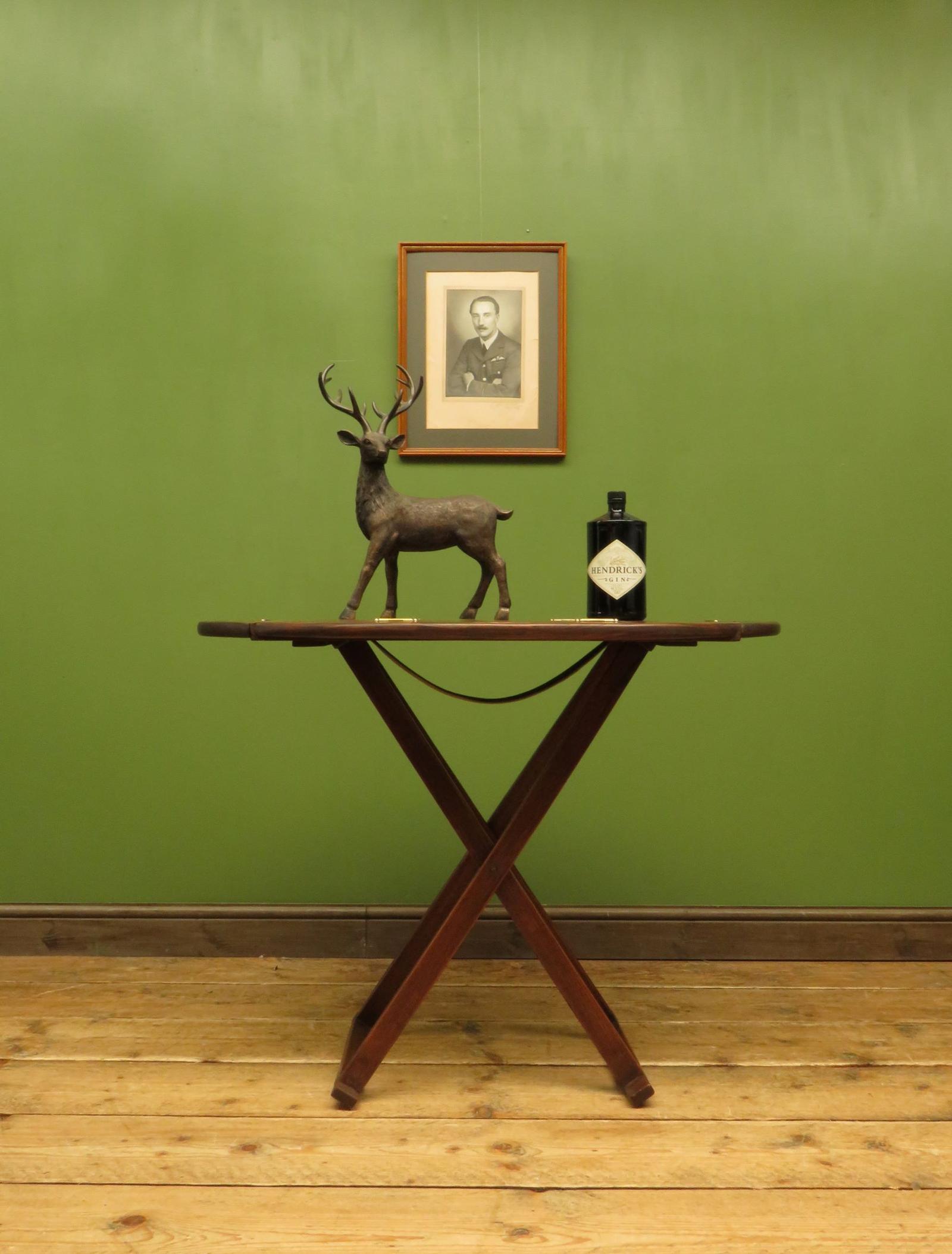 Antique Campaign Style Oak Butlers Tray on Folding Stand