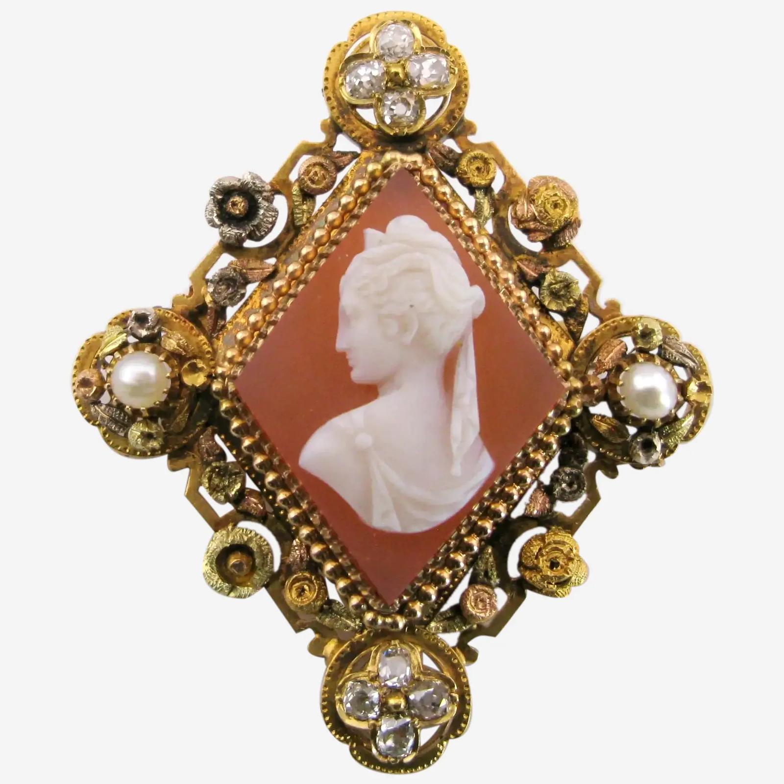 Antique Carnelian Hardstone Cameo Brooch 18k Gold, Diamonds Cultured Pearls