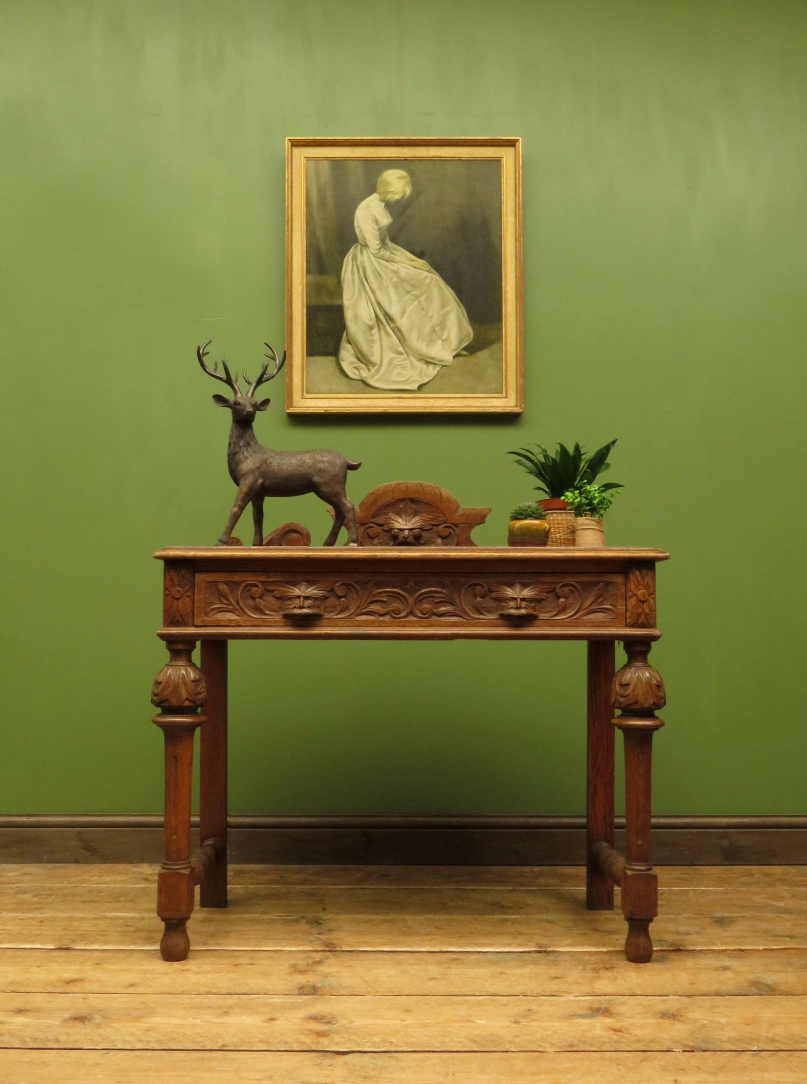 Antique Carved Green Man Pussy Oak Console Table with Drawer