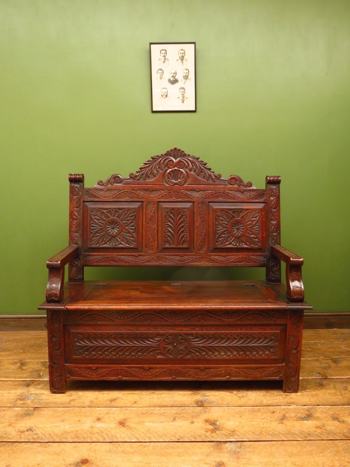 Antique Carved Oak Bench, Box Settle, Hall Seat Shoe Storage