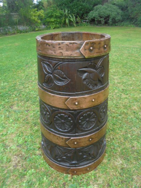 Antique Carved Oak Copper Bound Stick Stand / Hall Stand