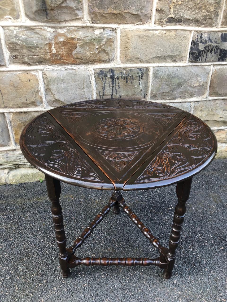 Antique Carved Oak Drop Leaf Cricket Table