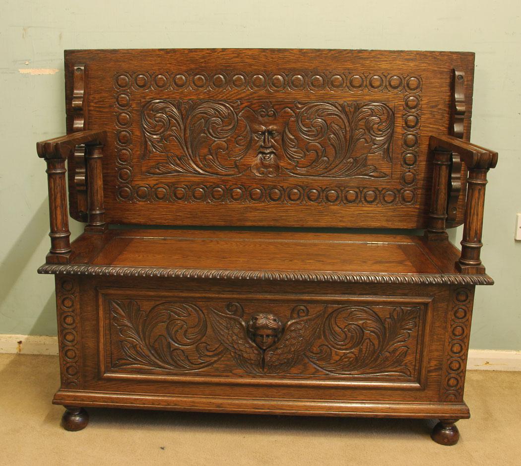 Antique Carved Oak Monks Bench Hall Seat Settle