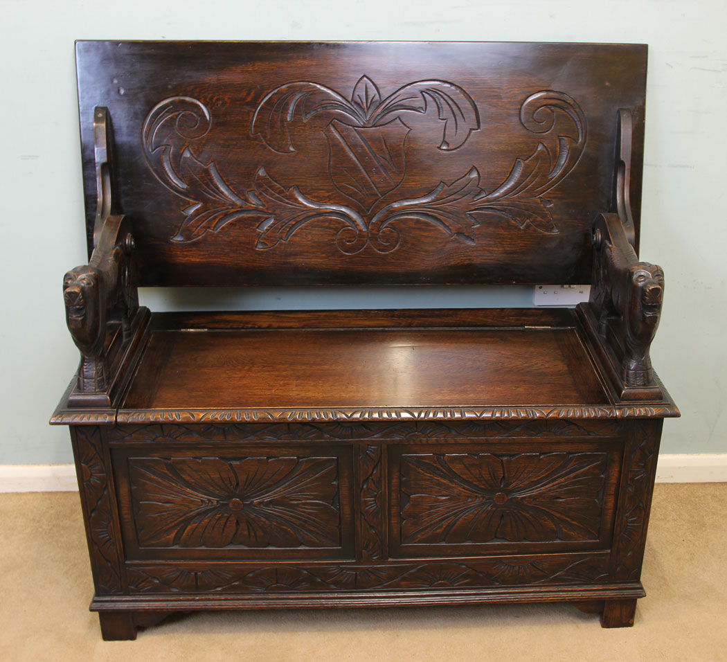 Antique Carved Oak Monks Bench / Hall Seat / Settle c.1910