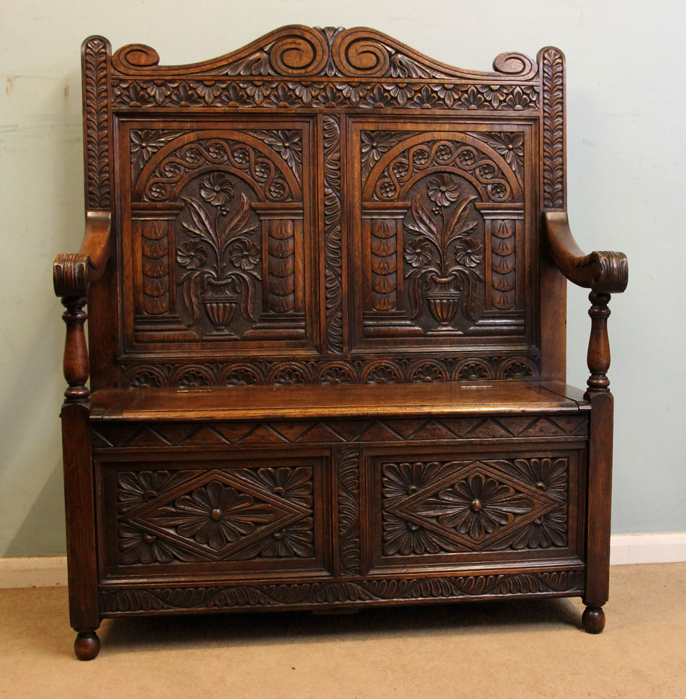 Antique Carved Oak Settle Hall Seat Bench