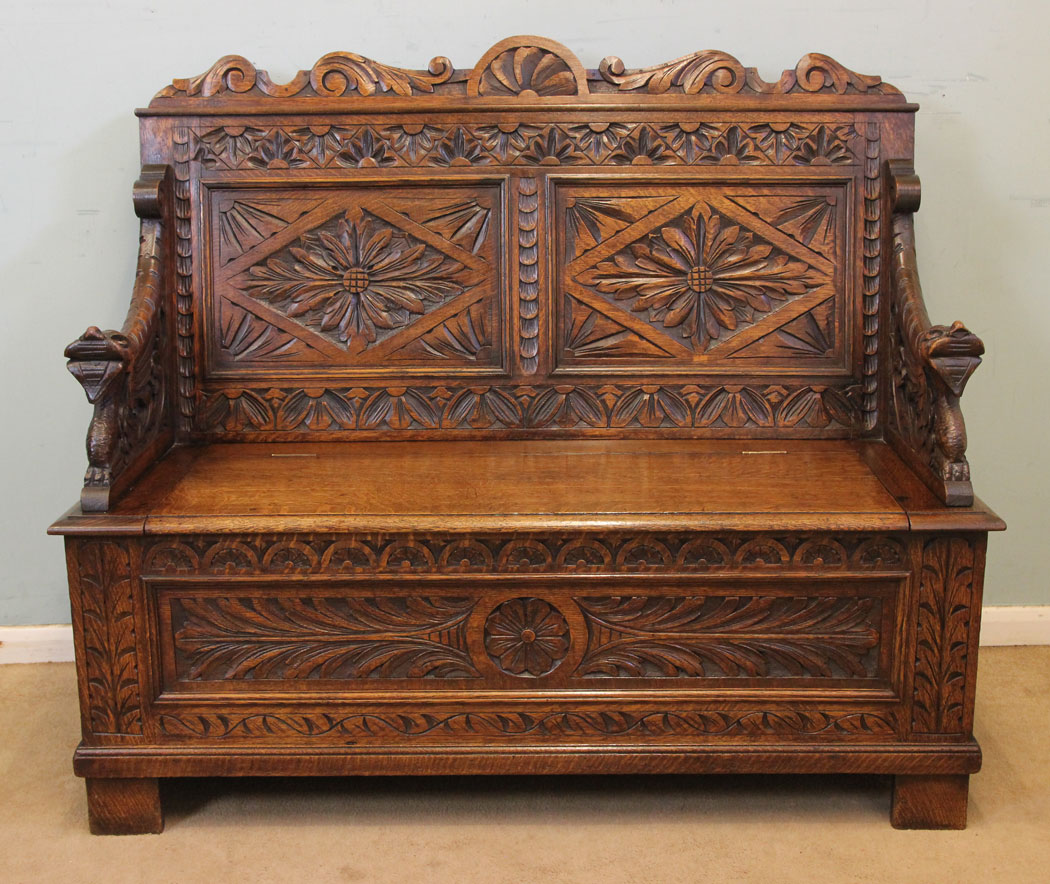 Antique Carved Oak Settle, Monks Bench, Hall Seat