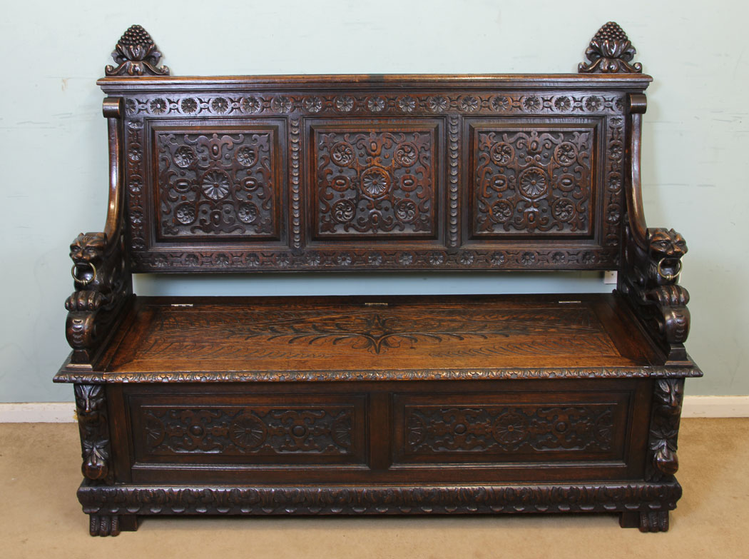 Antique Carved Oak Victorian Settle, Hall Seat Bench