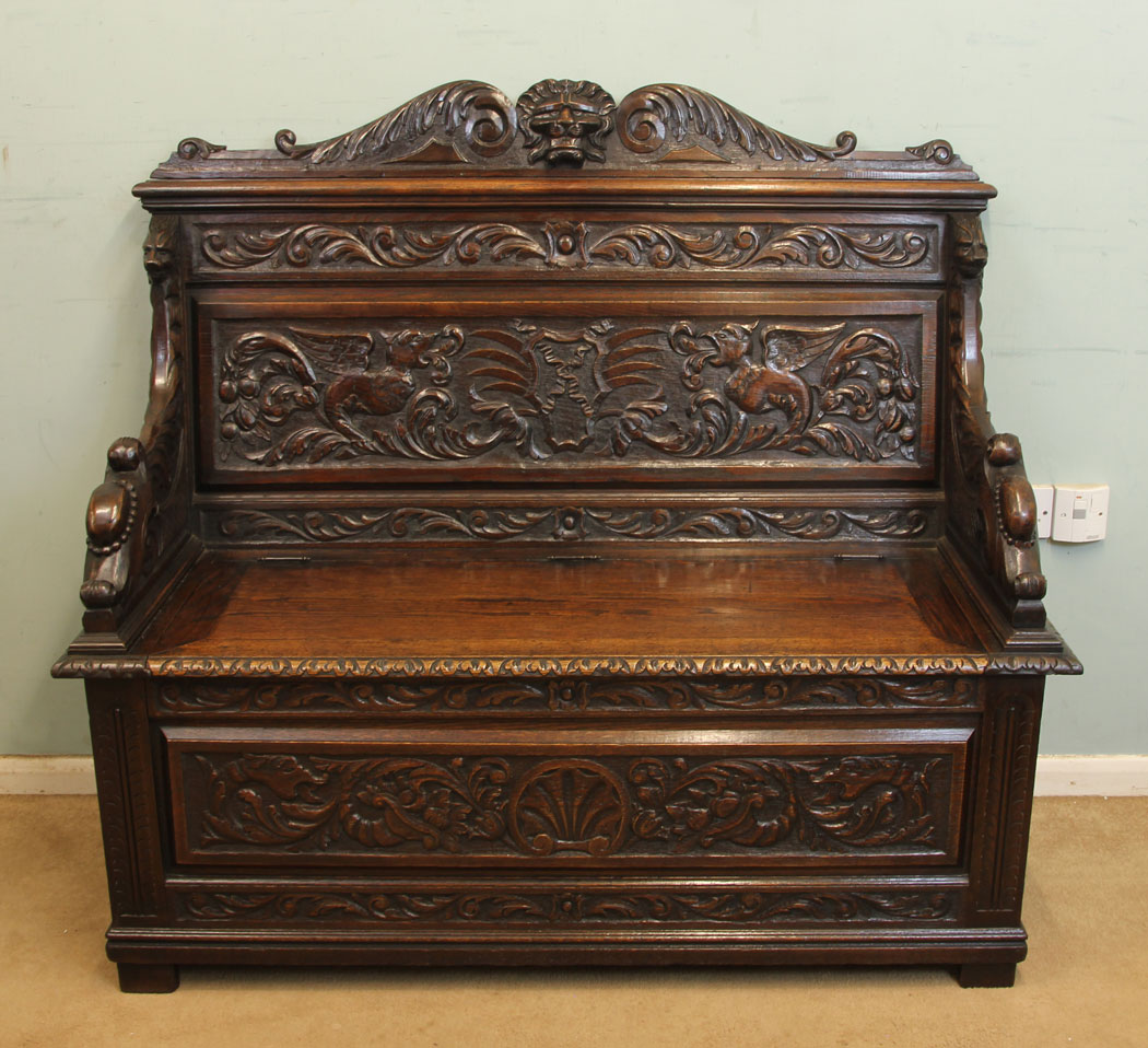 Antique Carved Oak Victorian Settle Monks Bench Hall Seat
