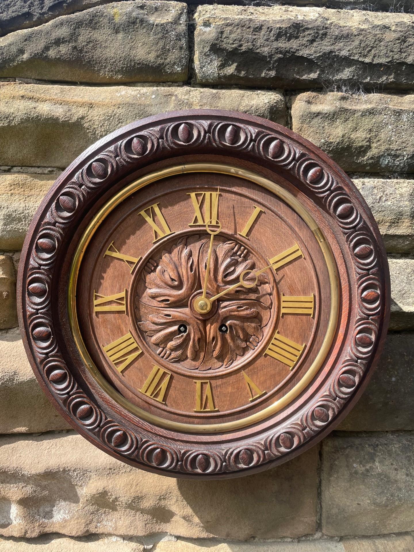 This Antique Carved Oak Wall Clock is located in West Yorkshire, United Kingdom