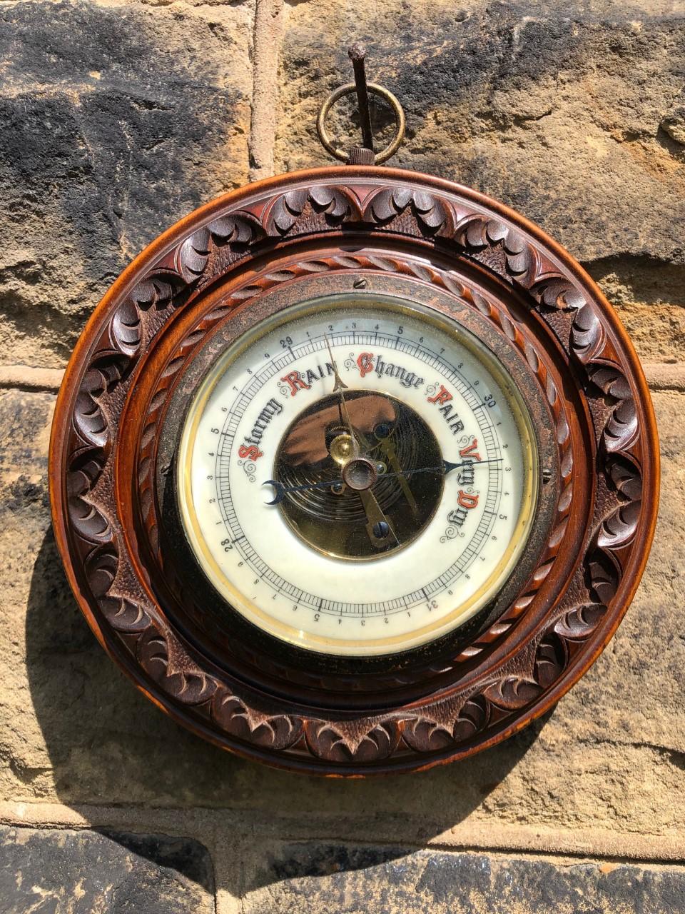 Antique Carved Walnut Aneroid Barometer