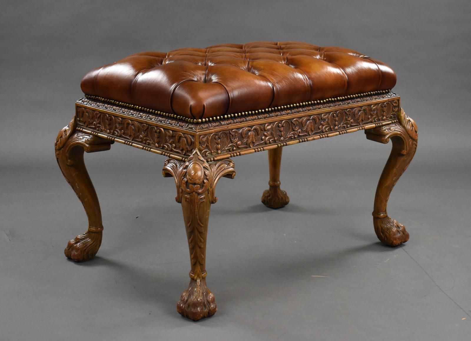 Antique Carved Walnut Leather Foot Stool by Maple & Co