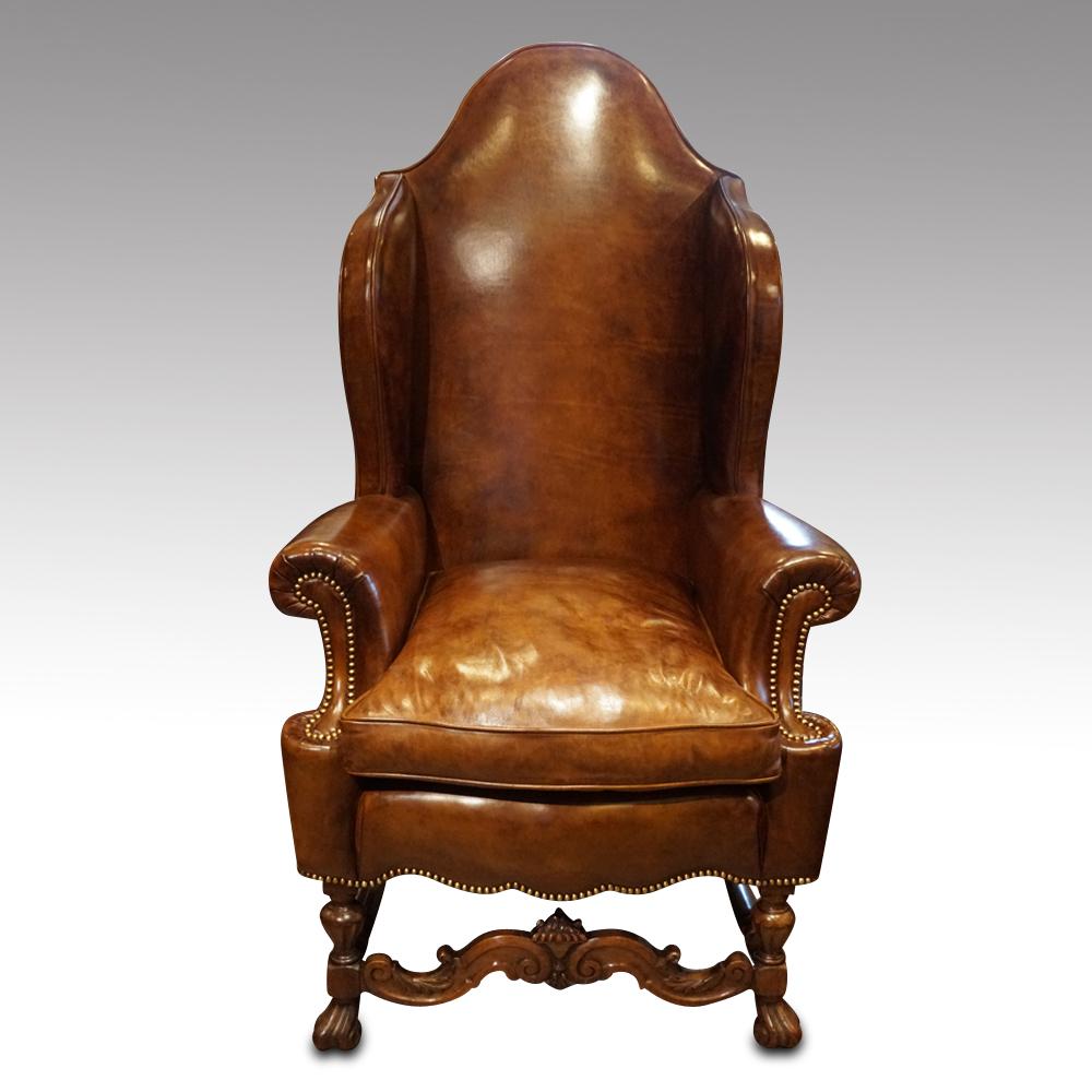 Antique Carved Walnut Leather Wing-back Chair (1 of 12)