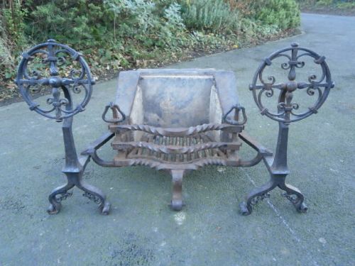 Antique Cast Iron & Steel Fire Basket Dog Grate c.1860
