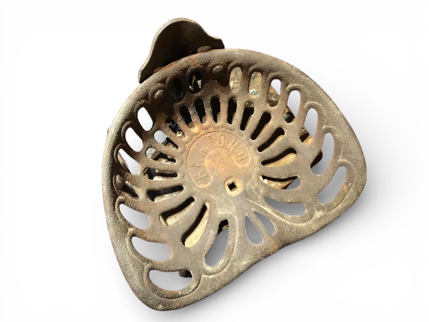 Antique (or possibly vintage) cast iron metal tractor seat from the 1920s probably. Made by Bamford, it's a Lion Horserake, according to the writing on the back, underneath a rather impressive casting of a rampant lion. Bucket shaped seat with raised sides and central ridge for ultimate comfort (!). Drainage holes to let the rain out..